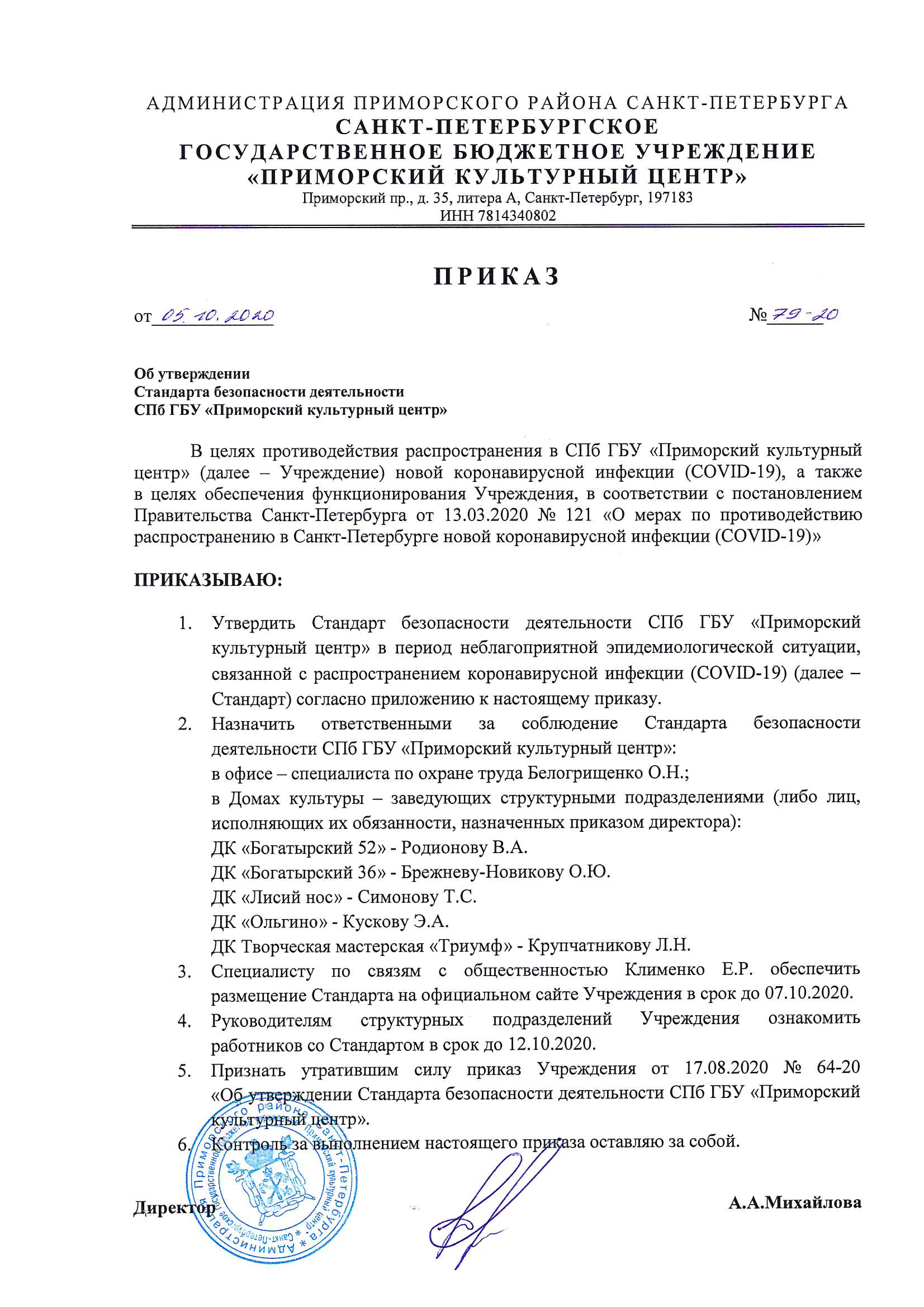 - Приказ от 05.10.2020 «Об утверждении стандарта безопасности деятельности СПб ГБУ «Приморский культурный центр»