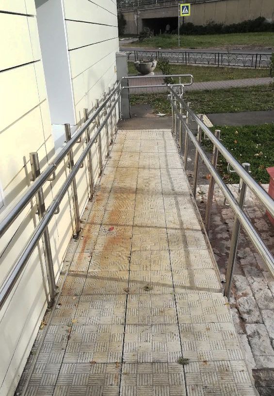 Основной вход в здание находится с улицы Раздельной, пандус, оборудованный поручнями расположен с обратной стороны здания.