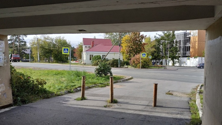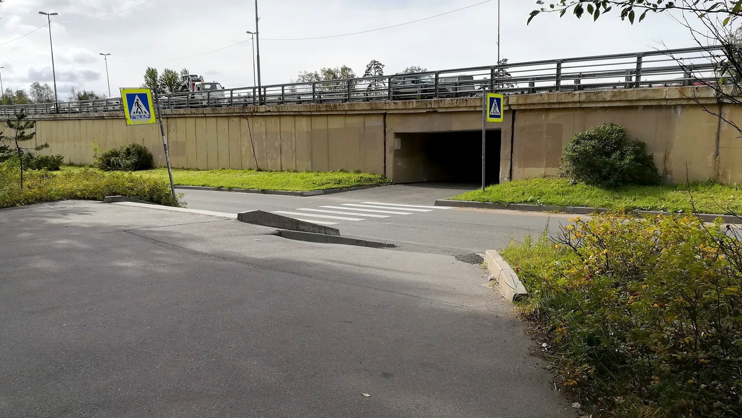 Плавный спуск к нерегулируемому пешеходному переходу и тоннелю