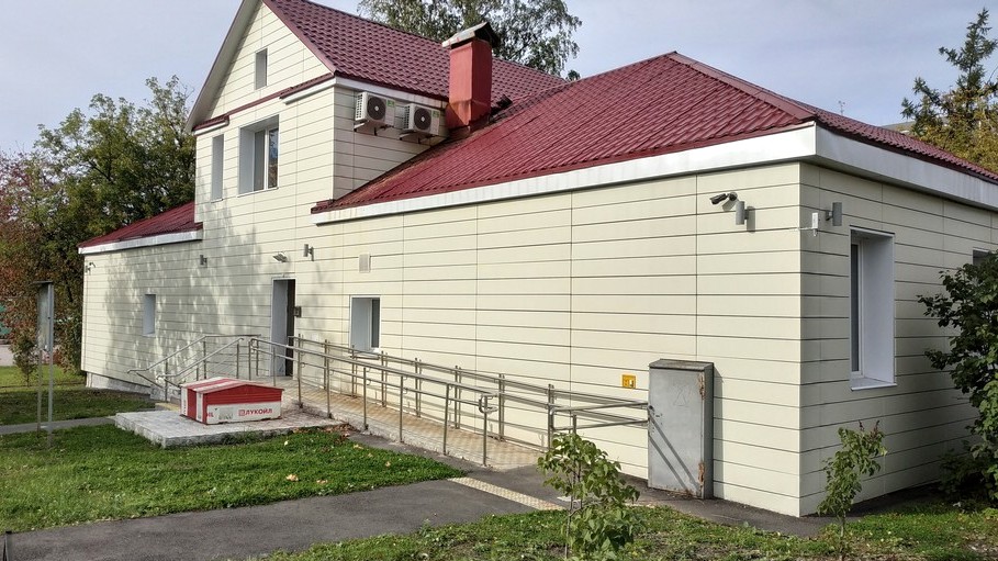 - Оборудован отедельный вход с пандусом и поручнями с обратной стороны здания.